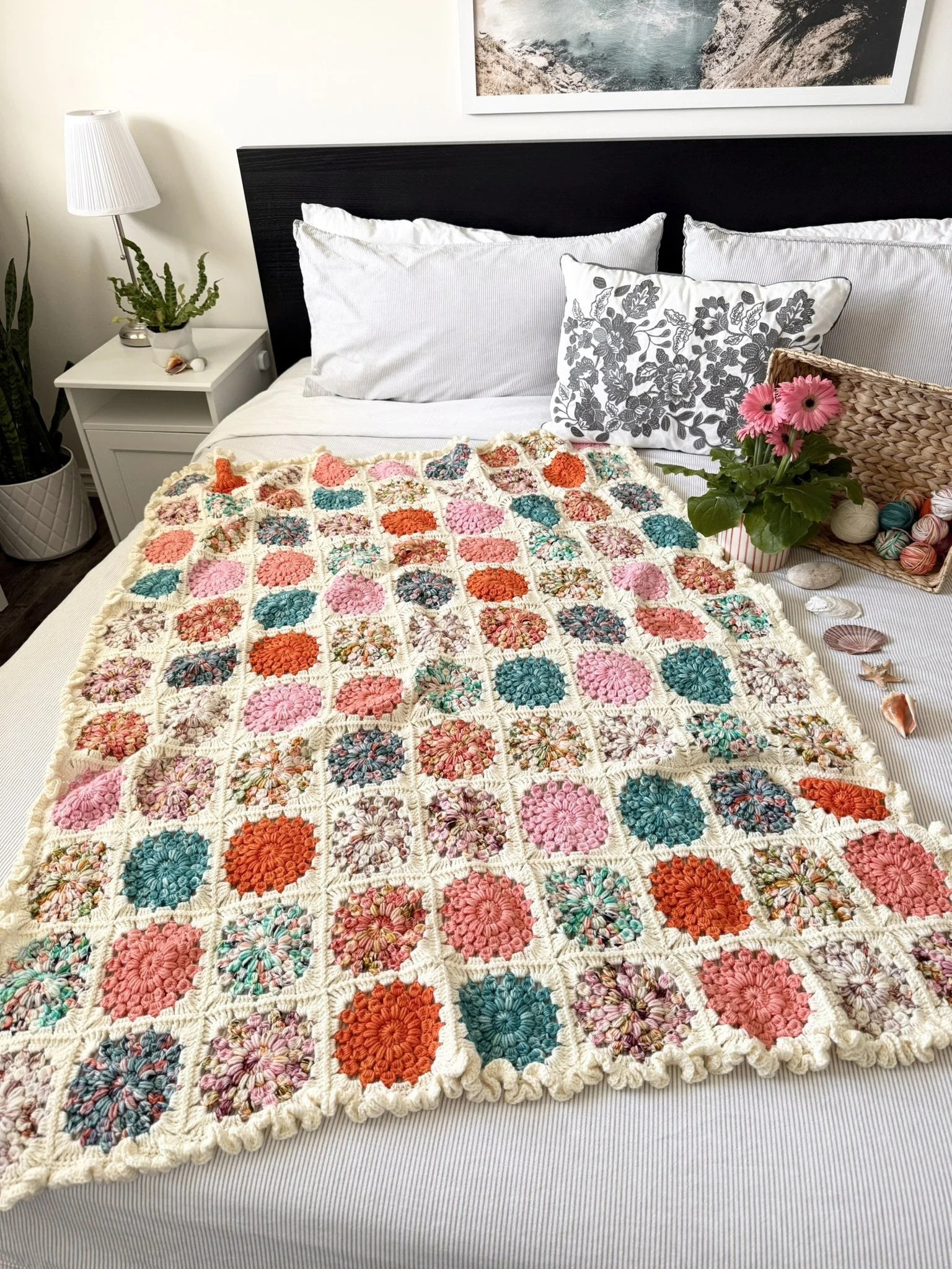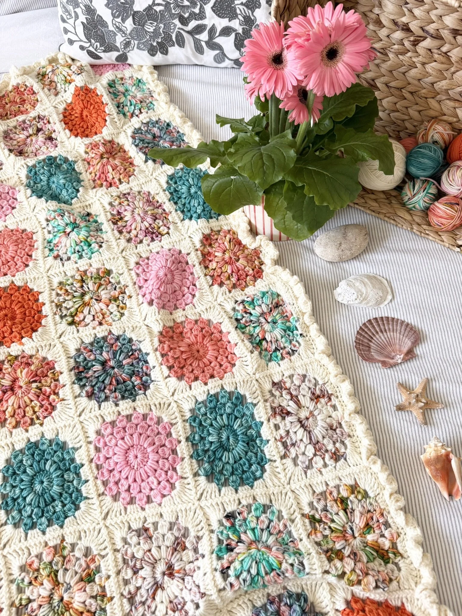 The Winters are grey here in Canada-but not from where I’m sitting! A blanket so cheerful it’s bound to remind you of tropical getaways and warmer, sunnier days ahead.