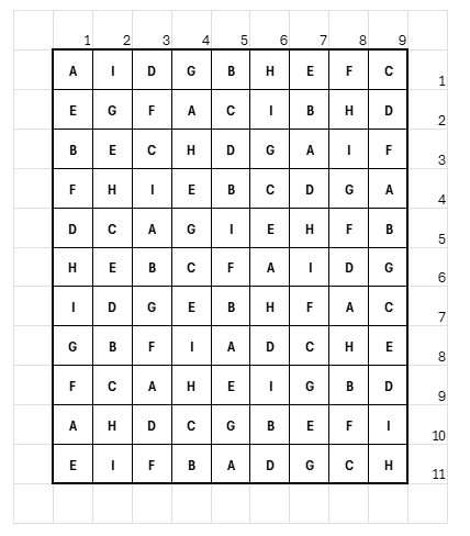 Example: First row will be joined from square number 9 (C) across to square number 1 (A). The second row will start with square number 18 (D) and be worked across to square number 10 (E).